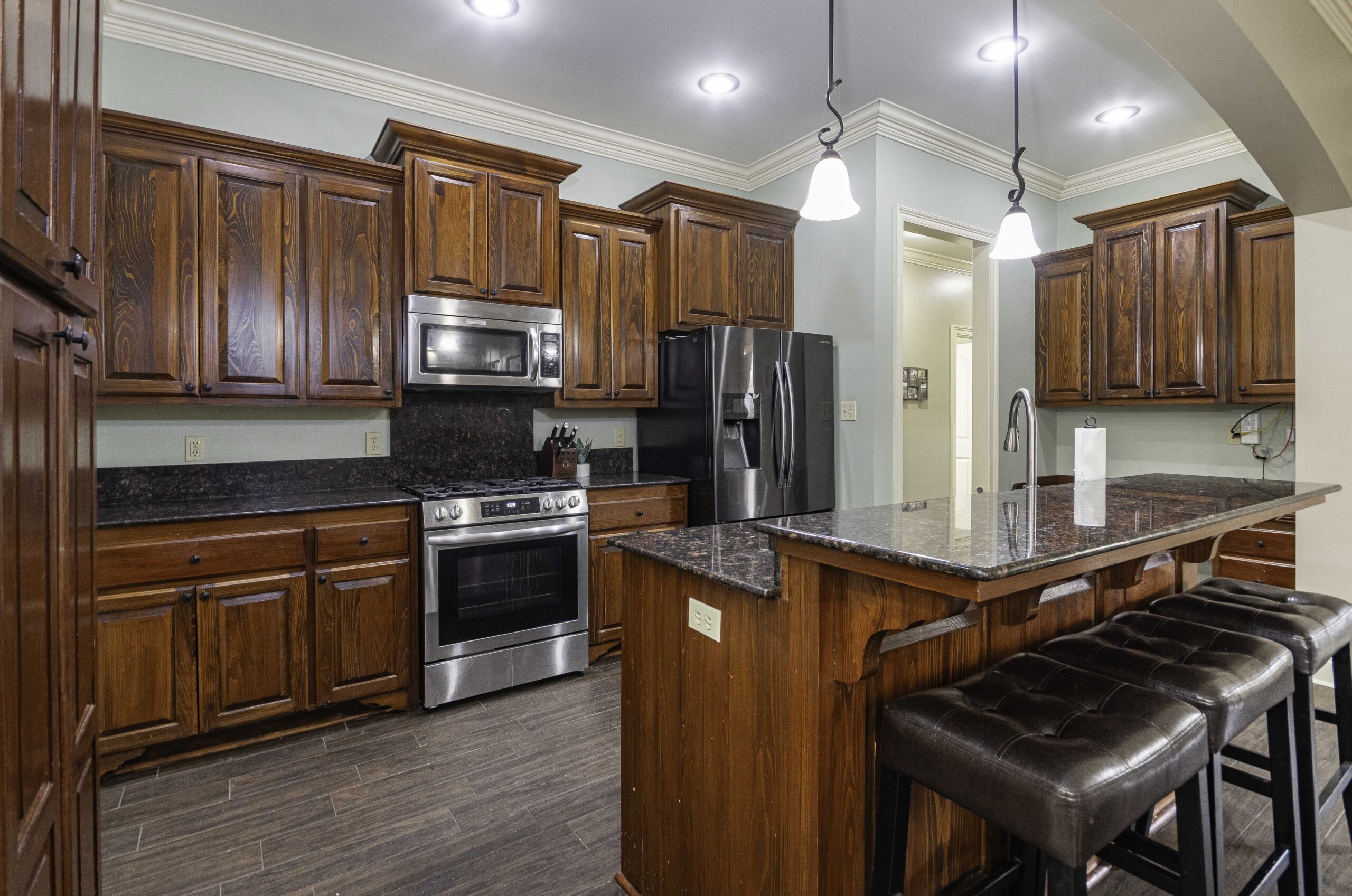Welcome to this beautifully maintained 3-bedroom, 2-bath home in Copper Meadows, offering a spacious open-concept layout and timeless finishes throughout. From the moment you walk in, you’re greeted by tall ceilings, crown molding, and an abundance of natural light that creates an inviting atmosphere in every room. The chef-friendly kitchen features rich custom wood cabinetry, granite countertops, stainless steel appliances, a center island with seating, and a dedicated built-in desk area—perfect for work, homework, or extra storage. The kitchen flows seamlessly into the dining area and large living room, complete with a cozy fireplace and views of the backyard, making this the heart of the home. The private primary suite is generously sized with soft natural lighting and an ensuite bathroom that includes dual vanities, a soaking tub, separate shower, and an oversized walk-in closet. Two additional bedrooms offer great space and flexibility for children, guests, or a home office. Step outside to a fully fenced backyard and large covered patio with plenty of room to play, relax, or entertain. You don’t want to miss this one, schedule your showing today!